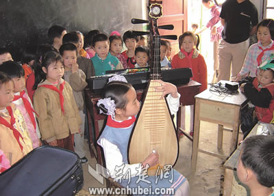 圖為紫金路小學(xué)學(xué)生到萬福村小學(xué)為學(xué)生作琵琶示范演奏。