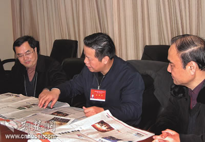 張昌爾說,各新聞單位高度重視“兩會”報(bào)道,會前充分準(zhǔn)備,作了周詳計(jì)劃。會中派出精兵強(qiáng)將,全力以赴。報(bào)紙、電視、廣播的報(bào)道各自亮點(diǎn)頻出,手法多樣,可讀性可視性可聽性大大增強(qiáng),較好地反映了代表委員參政議政的風(fēng)采。他希望參加“兩會”報(bào)道的新聞工作者繼續(xù)努力,更多地關(guān)注基層代表委員的聲音,報(bào)道他們在社會主義民主制度建設(shè)中發(fā)揮的作用,為重大政治性戰(zhàn)役報(bào)道落實(shí)“三貼近”原則積極探索。圖為張昌爾在評點(diǎn)湖北日報(bào)“兩會在線”。