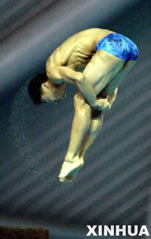 9月28日,陜西隊(duì)選手田亮在男團(tuán)十米跳臺(tái)的比賽中。最終,他以275.25分的成績(jī)獲得該項(xiàng)目第一名。當(dāng)日,在南京進(jìn)行的第十屆全國(guó)運(yùn)動(dòng)會(huì)跳水男子團(tuán)體比賽中,陜西隊(duì)以2155.25分的總成績(jī)獲得銅牌。(新華社記者孟永民攝)