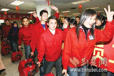 昨晚8時30分,統(tǒng)一著深紅服裝,拖著相同的紅色拉桿皮箱,89名湖北籍在浙江的農(nóng)民工微笑著走出武漢天河機場。