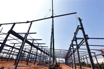 10月13日,咸安經(jīng)濟(jì)開發(fā)區(qū)華寧防腐科技產(chǎn)業(yè)園二期項(xiàng)目,工人們正在吊裝鋼架廠房。