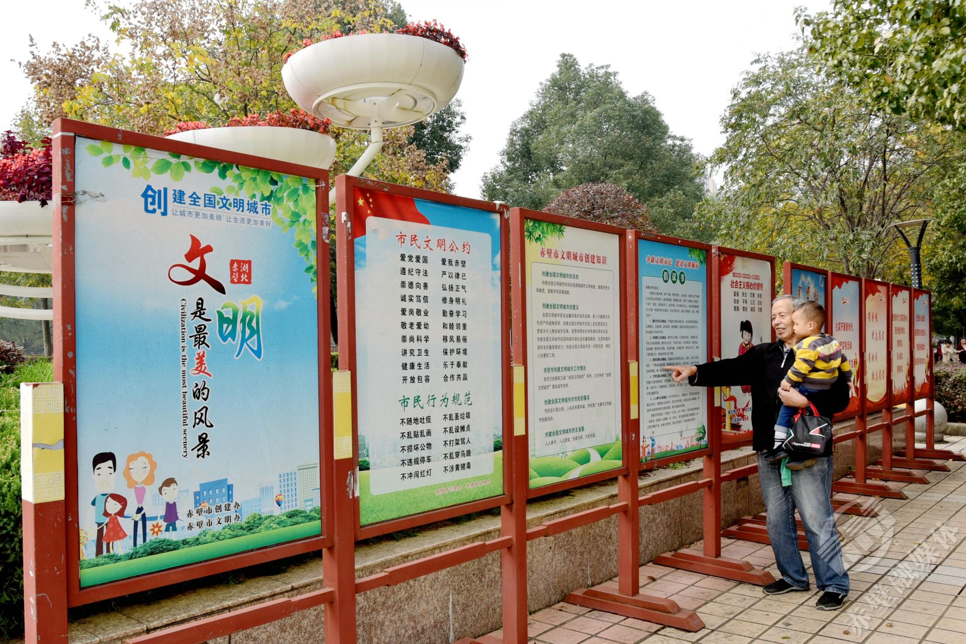 “今天帶孫子出來轉(zhuǎn)轉(zhuǎn),抬眼就看到這個(gè),正好教孫子認(rèn)認(rèn)字?!?0月29日,溜彎在人民廣場(chǎng)的羅爺爺指著文明創(chuàng)建宣傳展板開心的對(duì)記者說。