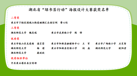 活動(dòng)期間,現(xiàn)場還公布了黃石市參加2024年湖北省“綠書簽行動(dòng)”海報(bào)設(shè)計(jì)大賽優(yōu)秀作品、優(yōu)秀組織單位,并為獲獎(jiǎng)單位和代表進(jìn)行頒獎(jiǎng)。