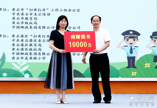 中國郵政集團(tuán)有限公司黃石城區(qū)分公司副總經(jīng)理柯海平表示,將積極參與“掃黃打非”工作,落實(shí)郵政快遞業(yè)“收寄驗(yàn)視、實(shí)名登記、過機(jī)安檢”三項(xiàng)制度,加大“畫像法”的宣貫力度,嚴(yán)防非法出版物流入寄遞渠道;積極宣傳“掃黃打非”有關(guān)政策法規(guī),引導(dǎo)告知廣大群眾不得寄遞非法有害出版物,共同助力未成年人健康成長,并向黃石市武黃路小學(xué)捐贈(zèng)1萬元圖書。