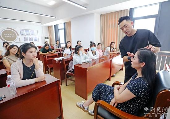 培訓室內,30名通過人社“一湖三鏈”數(shù)據(jù)湖+就業(yè)服務站鐵腳板匹配的女性居民,正在接受來自盛美化妝美甲培訓技能學校的就業(yè)指導師周艷君的精準培訓。