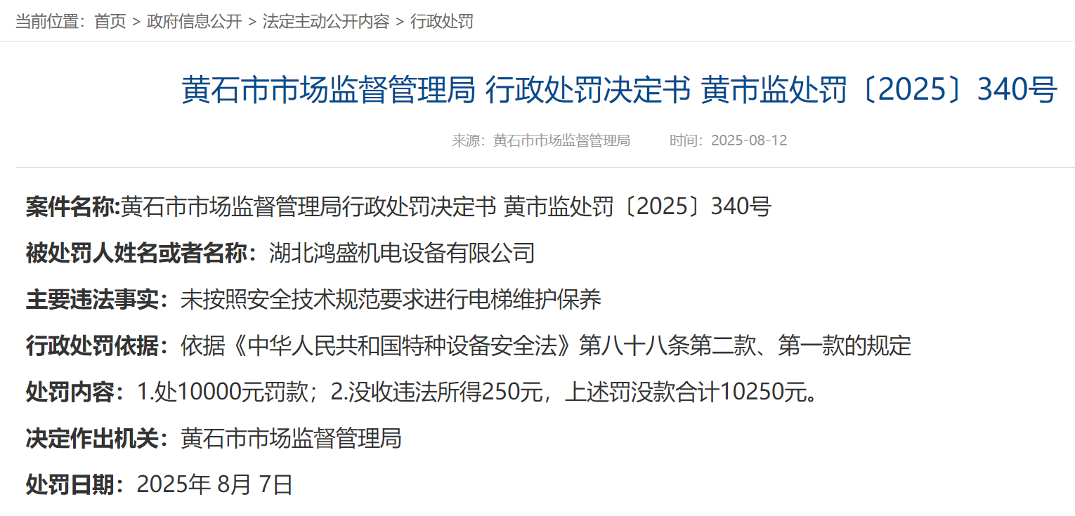 公告顯示,三家受處罰企業(yè)分別為湖北鴻盛機(jī)電設(shè)備有限公司、黃石市中信電梯工程有限公司和深圳市開元科創(chuàng)樓宇科技有限公司。主要違法事實(shí)均為“未按照安全技術(shù)規(guī)范要求進(jìn)行電梯維護(hù)保養(yǎng)”。依據(jù)《中華人民共和國(guó)特種設(shè)備安全法》第八十八條第二款、第一款的規(guī)定,黃石市市場(chǎng)監(jiān)督管理局在統(tǒng)一作出處10000元罰款的同時(shí),還分別對(duì)三家違法企業(yè)分別處以沒收違法所得250元、258.33元、282.27元。