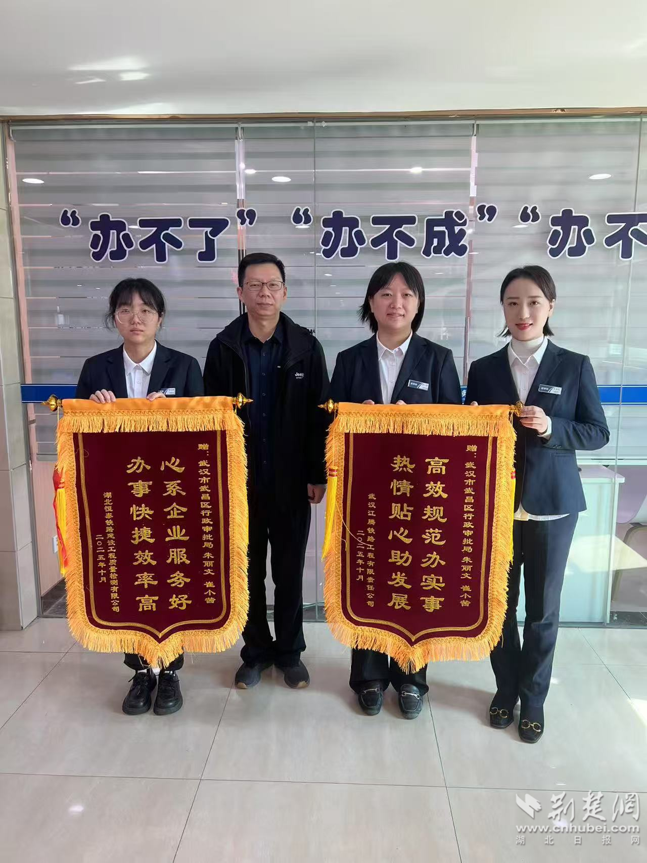 荊楚網(wǎng)(湖北日報網(wǎng))訊(記者 李燕 通訊員 李永波 王金丹)10月24日,中國鐵路武漢局集團旗下湖北恒泰鐵路建設(shè)工程質(zhì)量檢測有限公司、武漢江騰鐵路工程有限責(zé)任公司,順利辦結(jié)業(yè)務(wù)變更手續(xù)后,經(jīng)辦人董先生專程送來2面錦旗,向武昌區(qū)行政審批局工作人員表達謝意。