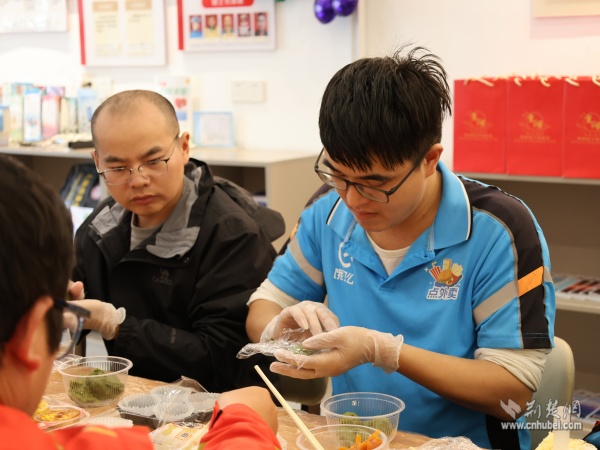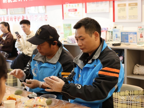 在制作青團(tuán)時,現(xiàn)場同步開展“黃鶴家人茶話會”,搭建起代際對話的橋梁?;ǖ躺鐓^(qū)紫陽之星小區(qū)黨支部書記金文芳講述了小區(qū)變遷故事,傳遞長者對騎手們的關(guān)懷;新就業(yè)群體入黨積極分子樂倩倩則分享了送餐途中幫扶孤寡老人的暖心經(jīng)歷。兩代人的真誠交流深化了情感共鳴,現(xiàn)場洋溢著家人般的溫暖氛圍。