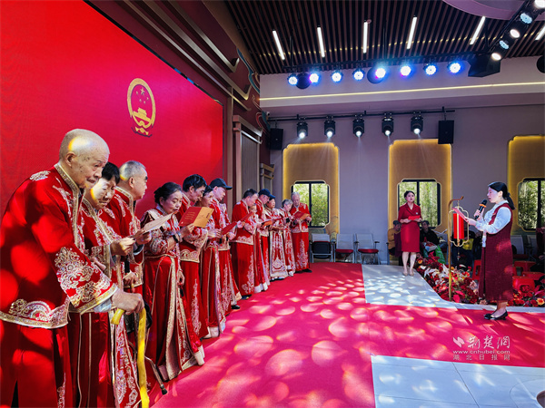 隨著輕柔音樂響起,身著中式禮服的夫婦們手挽手踏上紅毯。歲月雖在臉龐刻下痕跡,卻擋不住眼中對彼此的溫柔。他們共同執(zhí)筆書寫婚書,一撇一捺間重溫“執(zhí)子之手”的初心;交杯共飲合巹酒,延續(xù)“同甘共苦”的承諾;交換黑檀朱砂掛件,“你一半我一半”的信物成了彼此最深的牽絆。在婚姻登記處頒證員的見證下,夫婦們接過“結(jié)婚紀(jì)念證書”與鮮花,現(xiàn)場掌聲、祝福聲此起彼伏。