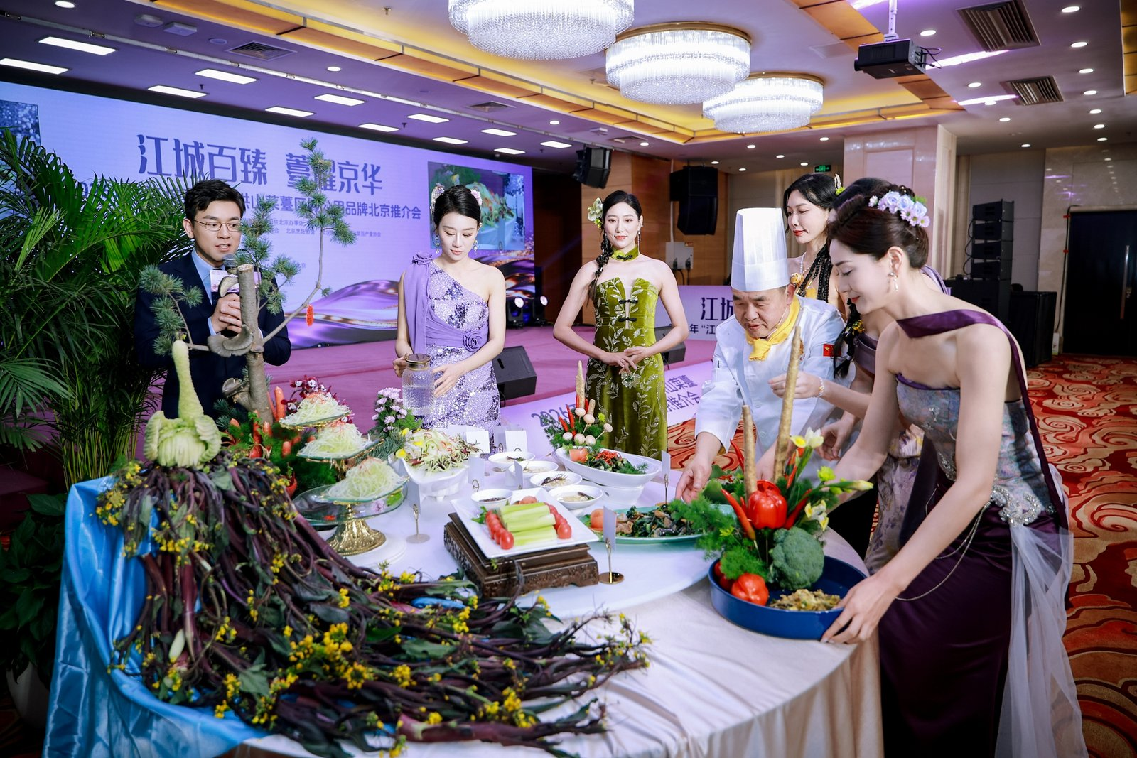 活動(dòng)現(xiàn)場,《千年一“薹”,京誠所愛》情景劇生動(dòng)詮釋洪山菜薹的傳承與創(chuàng)新,產(chǎn)品走秀與藝術(shù)插花表演凸顯其美學(xué)價(jià)值,楚菜名廚現(xiàn)場演繹“一薹多吃”宴席,展現(xiàn)菜薹融入京鄂風(fēng)味的烹飪創(chuàng)意。京城網(wǎng)紅大廚隋坡登臺品鑒,為洪山菜薹實(shí)力“打call”?,F(xiàn)場同步設(shè)置國風(fēng)市集,展出鮮薹、鎖鮮產(chǎn)品及禮盒,供嘉賓品鑒體驗(yàn)。