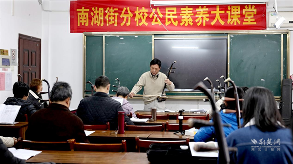荊楚網(wǎng)(湖北日報網(wǎng))訊(記者 李燕 通訊員 羅嘉柯)早上九時,武昌區(qū)南湖街道一棟樸素的三層小樓已開始躍動起生活的韻律。二胡聲悠揚,葫蘆絲清亮,提著樂器的阿姨們步履輕快、笑意盈盈地走進樓內(nèi)。這里是南湖街老年大學(xué),一個每日門庭若市、笑語盈窗的地方。每一位走進這里的老人,都仿佛推開了另一扇生活的門——門外是瑣碎日常,門內(nèi)卻是歌聲、筆墨、舞蹈與友誼。而這幅生機盎然的景象,離不開一位始終與他們并肩同行的人——校長李雨嘉。