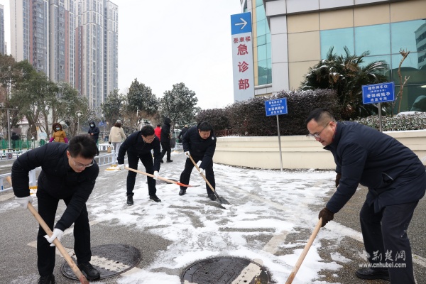 武漢大學(xué)人民醫(yī)院黨委書(shū)記、院長(zhǎng)與干部職工一同清掃院區(qū)積雪。 通訊員供圖