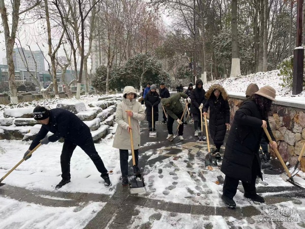 轄區(qū)文明單位積極行動(dòng),彰顯社會(huì)責(zé)任。黃鶴樓公園管理處、辛亥革命博物院領(lǐng)導(dǎo)班子帶隊(duì)鏟雪除冰,保障游客安全游覽;武漢大學(xué)人民醫(yī)院黨委書(shū)記、院長(zhǎng)與干部職工一同清掃院區(qū)積雪,確?;颊呔歪t(yī)暢通;武漢市第三醫(yī)院領(lǐng)導(dǎo)干部聯(lián)合武昌區(qū)九三學(xué)社三醫(yī)院支社社員開(kāi)展鏟雪行動(dòng),筑牢患者就醫(yī)安全防線;聯(lián)通武昌區(qū)分公司組織清除辦公樓及周邊道路積雪;中國(guó)郵政武昌區(qū)分公司各網(wǎng)點(diǎn)員工利用營(yíng)業(yè)前后時(shí)間清掃門(mén)前冰雪,鋪設(shè)防滑墊、設(shè)立提示牌,為客戶開(kāi)辟“安心通道”;七四三五工廠保衛(wèi)處以“雪停人動(dòng)、人到雪清”的擔(dān)當(dāng),組織清掃廠區(qū)大門(mén)區(qū)域積雪,筑牢安全防線。