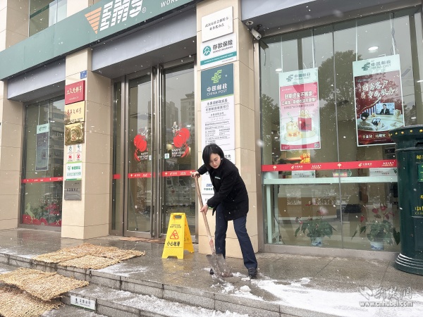 中國(guó)郵政武昌區(qū)分公司各網(wǎng)點(diǎn)員工清掃門(mén)前冰雪。 通訊員供圖