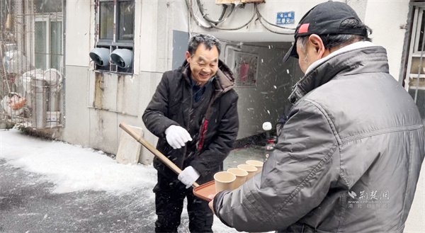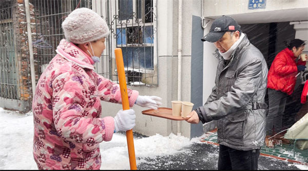 “大家歇一歇,喝點(diǎn)姜茶暖暖身子!”正當(dāng)眾人干勁十足時(shí),一位黨員居民端著熱氣騰騰的姜茶走來,將暖茶遞到每個(gè)人手中?!拔壹依习橹匕Y需要照顧,沒辦法和大家一起出力,只能煮點(diǎn)熱茶讓大家暖和一下?!币槐?、一聲問候,凝聚起鄰里間最真摯的情誼,為掃雪行動(dòng)更添溫情。