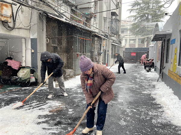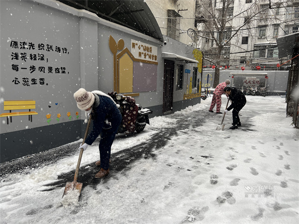 一大早,三名居民志愿者便率先行動(dòng),有人清掃路面浮雪,有人揮舞鐵鍬鏟除薄冰,還有人主動(dòng)疏導(dǎo)過往居民,提醒大家小心路滑。在志愿者的帶動(dòng)下,越來越多居民走出家門加入掃雪隊(duì)伍,原本寂靜的小院變得熱鬧起來,歡聲笑語(yǔ)驅(qū)散了冬日寒意,鄰里距離也在并肩勞動(dòng)中悄然拉近。社區(qū)工作人員帶著掃雪工具趕來時(shí),正撞見熱火朝天的勞動(dòng)場(chǎng)景,隨即也加入掃雪行列。