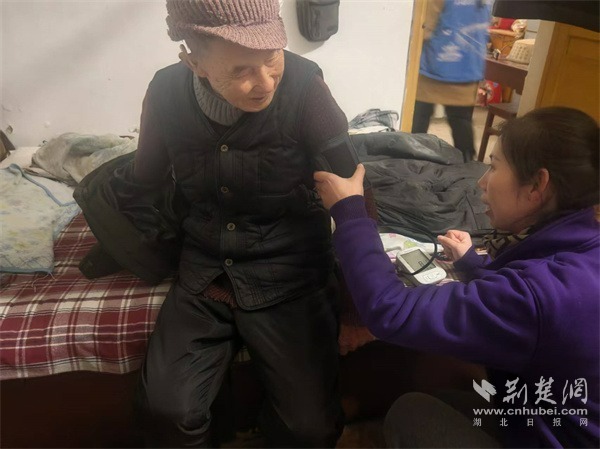 社區(qū)養(yǎng)老顧問為老人監(jiān)測血壓。 通訊員供圖