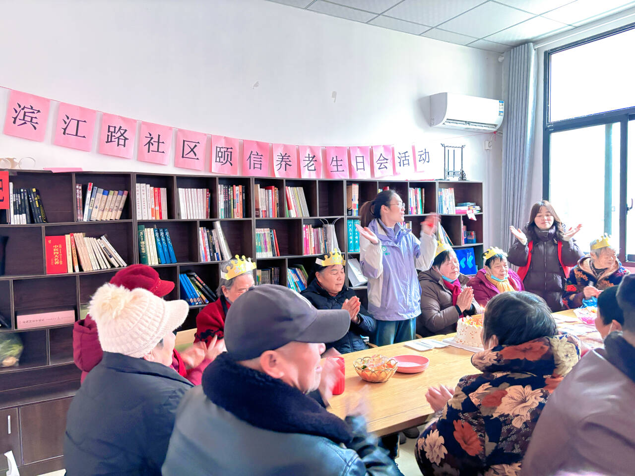 濱江路社區(qū)的活動(dòng)以“情暖冬日 愛在頤信”為主題,活動(dòng)現(xiàn)場(chǎng)布置雅致,粉色主題橫幅醒目溫馨,四位壽星頭戴金燦燦的生日帽,圍坐在一起,眼底滿是期待,臉上漾著幸福的笑意。