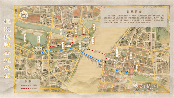 “江漢攬勝”主題游線以百年輪渡為紐帶,串聯(lián)起5A級黃鶴樓景區(qū)與4A級知音文化旅游區(qū),集亭、臺、樓、閣、殿五種傳統(tǒng)建筑形制于一體,生動展現(xiàn)武漢“半城山水半城詩”的城市意象。游線自黃鶴樓啟程,途經(jīng)斗級營、戶部巷,乘輪渡橫渡長江,觀賞晴川燈會,最終探訪知音殿、游覽古琴臺,集萃武漢長江兩岸自然風(fēng)光、文化地標(biāo)與城市煙火氣,是自然與人文、傳統(tǒng)與現(xiàn)代交融的精品線路。
