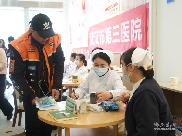互動環(huán)節(jié)采取“一站式集成服務”,將活動氛圍推向高潮。社保專家咨詢臺前,騎手們排隊咨詢靈活就業(yè)參保、待遇申領等問題;醫(yī)護人員同步開展義診服務,提供血糖血壓監(jiān)測、骨質疏松檢測,并手把手教大家正確使用筋膜槍,緩解肌肉疲勞;漢口銀行黃鶴樓支行工作人員現場為有需要的騎手辦理社??ǎ①浰唾N心小禮品,打通職業(yè)傷害待遇享受“最后一公里”;愛聯盟工作室咨詢臺前,幾位年輕騎手駐足咨詢、登記意向,在忙碌生活中邂逅溫暖期待。