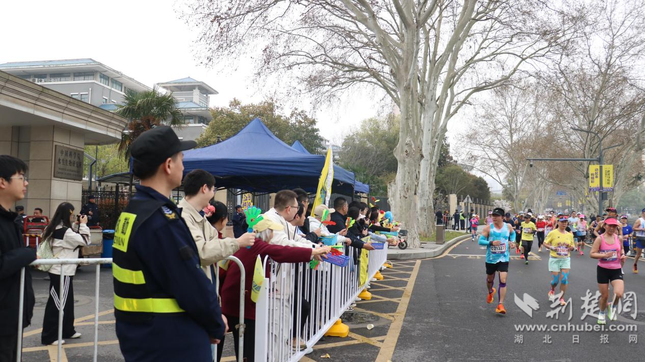 “加油!加油!”“你們是最棒的!”……當(dāng)天,位于賽道沿線的中國(guó)科學(xué)院水生生物研究所自發(fā)組織了“助威團(tuán)”??蒲腥藛T們暫時(shí)放下手中的顯微鏡,揮舞著彩旗和手舉牌,用最熱烈的吶喊為中外跑者加油鼓勁,將嚴(yán)謹(jǐn)科研之外的澎湃熱情灑滿賽道。除了吶喊助威,轄區(qū)共建單位還貼心地設(shè)置了“愛(ài)心補(bǔ)給站”,為跑者提供飲用水、水果等補(bǔ)給物資,不僅為選手們“充電”,更讓這場(chǎng)國(guó)際賽事充滿了“珞珈溫度”。