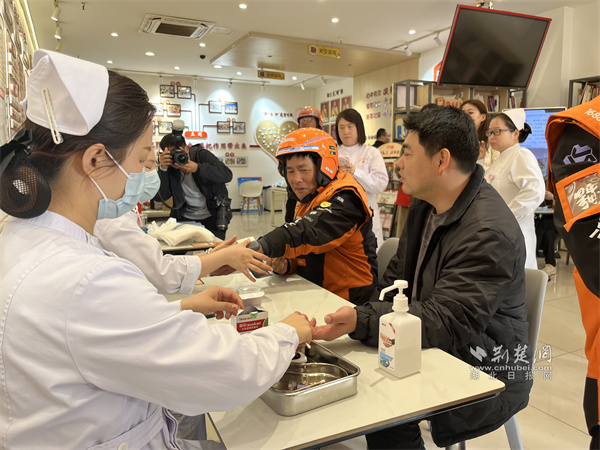 醫(yī)務(wù)工作者為騎手測(cè)量血壓和血糖。 通訊員供圖