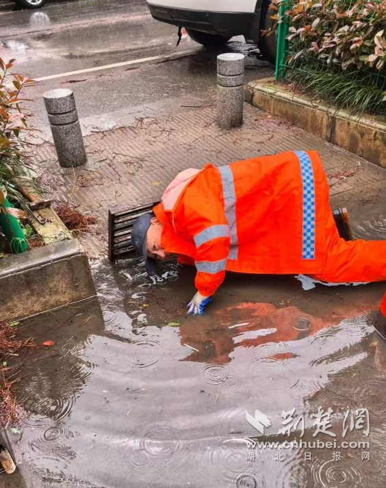 在街道的主次干道上,一群“橙色身影”同樣在風(fēng)雨中逆行。晨曦路、康泰路沿線,雨水裹挾著落葉、淤泥和塑料袋涌入雨水井,排水口頻頻告急。湘口街環(huán)衛(wèi)中心20名作業(yè)人員頂風(fēng)冒雨,對(duì)40余處井蓋展開(kāi)緊急清淤。黨齡32年的彭新山俯身徒手掏挖的身影格外引人注目。他半跪在積水中,手持鐵鉤撬開(kāi)井蓋,直接探進(jìn)胳膊一把把掏出堵塞的枯枝爛葉,泥漿濺滿臉身也渾然不顧?!斑@個(gè)口子堵得厲害,不掏干凈路面積水下不去,老百姓走路、開(kāi)車都危險(xiǎn)?!?/span>