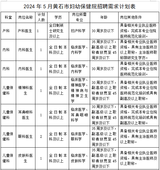 荊楚網(wǎng)(湖北日?qǐng)?bào)網(wǎng))訊(記者 謝龍飛)近日,黃石市婦幼保健院發(fā)布2024年5月招聘聘用制工作人員公告,將招聘18名聘用制工作人員,涵蓋產(chǎn)科醫(yī)生、內(nèi)科醫(yī)生、精神科醫(yī)生、兒科醫(yī)生等,具體崗位詳見下表。