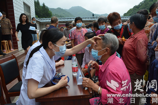 楊柳村位于位于鄖陽區(qū)西南部的大山深處,距離十堰市區(qū)50余公里,是十堰市稅務(wù)局鄉(xiāng)村振興聯(lián)系點,村里以老年人居多。聽說市人民醫(yī)院的專家要來義診,村民們早早就來到村委會,在市稅務(wù)局駐村工作隊的精心組織下,佩戴口罩排起了長隊。簡短的介紹儀式結(jié)束后,來自市人民醫(yī)院心血管內(nèi)科、兒科、消化內(nèi)科、睡眠醫(yī)學(xué)科、內(nèi)分泌科等專業(yè)學(xué)科的8位專家便立即開始為村民診療。