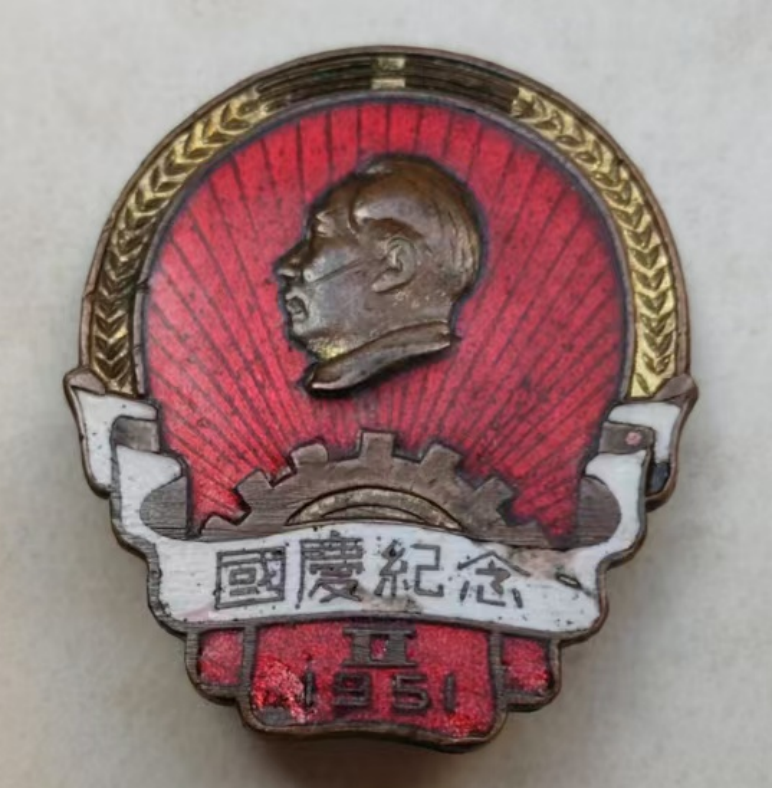 這枚國慶紀念章分上下兩部分:上部分為大半圓形,由金黃色麥穗鑲邊,代表農民階級,中間為毛主席側面浮雕頭像,頭像下面是古銅色齒輪,象征著工人階級。齒輪上橫著一條白色的扭帶,將工人和農民緊密地聯(lián)系在一起。扭帶上面寫著 “國慶紀念”字樣。下部分為兩個重疊的長方形,上面鑄有“Ⅱ”和“1951”。 整個紀念章的主色調為紅色,銅質。