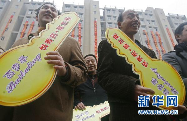 這是首批住戶代表在武漢市最大的保障性住房項目——百步亭社區(qū)悅秀苑、景蘭苑交房儀式上領(lǐng)到鑰匙(2009年12月8日攝)。 新華社發(fā)